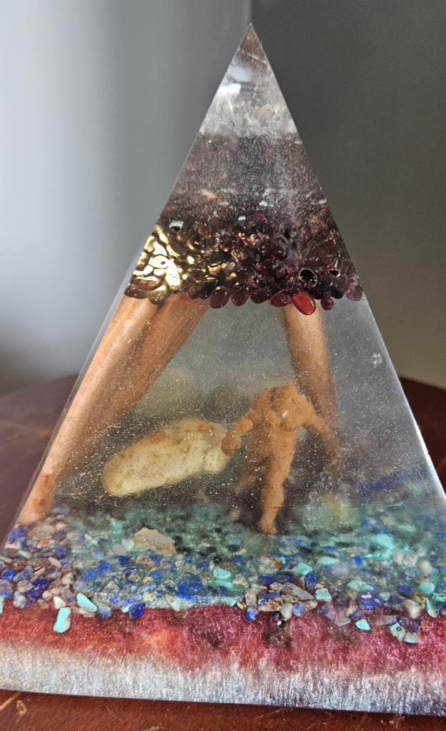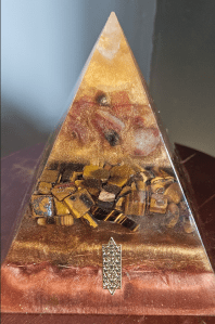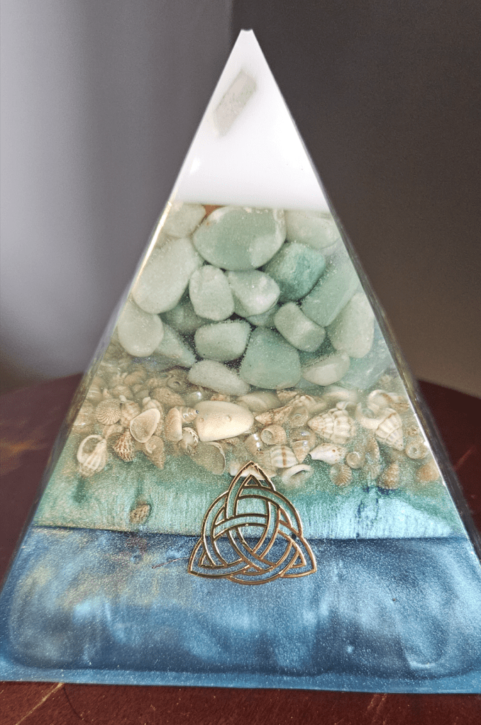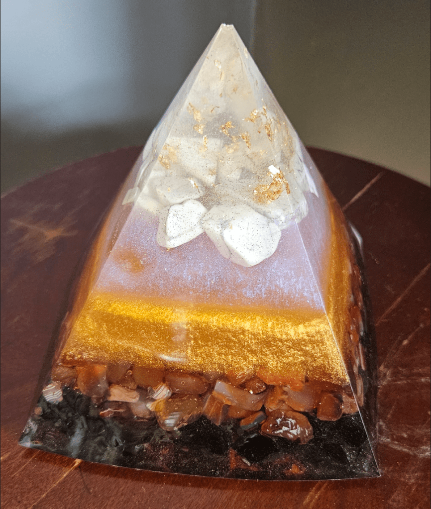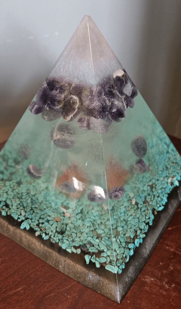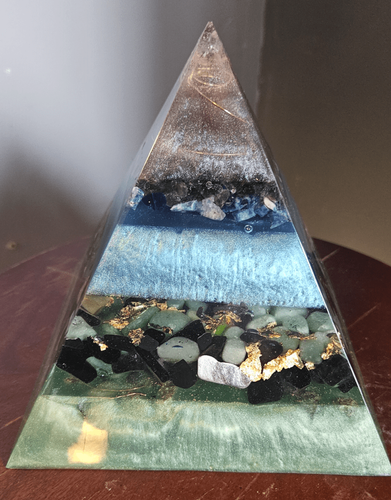 A pyramid has healing qualities within its specific geometrical structure. The pyramid shape collects and amplifies energy from its surroundings. Its ability to concentrate and focus electromagnetic energy, acting as a resonator, amplifies the energy of the orgonite exponentially. Not all orgonites need to be pyramids but the combination of the two sacred mechanisms creates a very powerful healing tool. The healing energy of the stones and crystals layered within a pyramidal orgonite will be enhanced. The result is a cleansing energy field high above the device and out into the surrounding area.